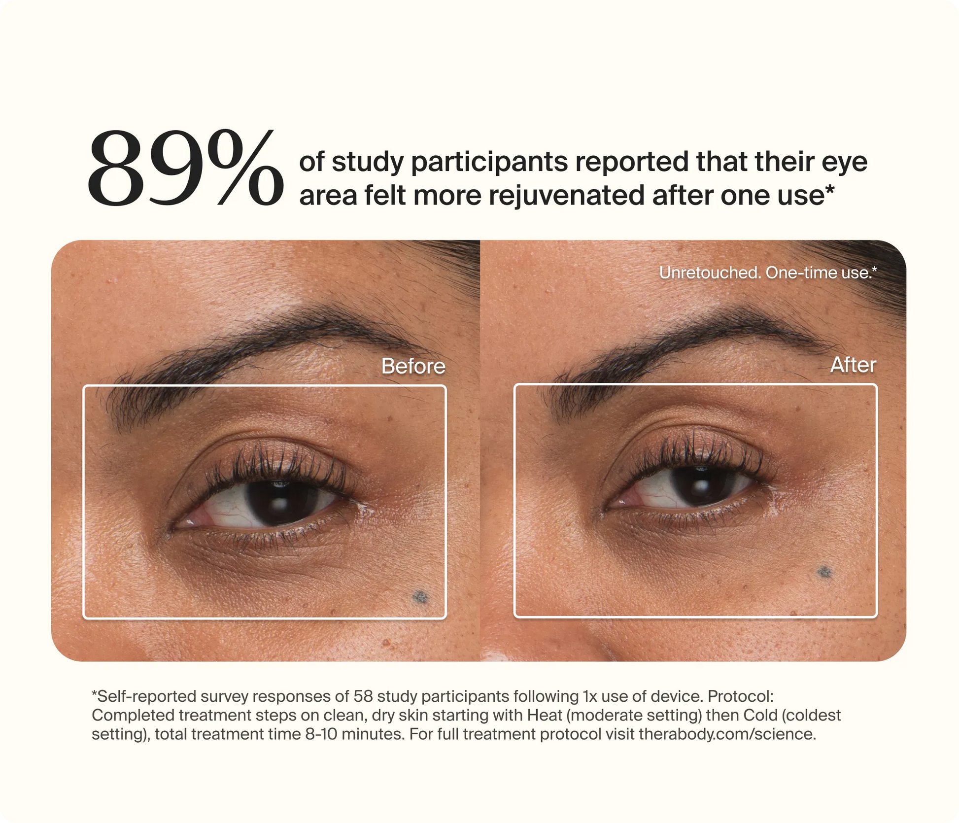 - ³Self-reported survey responses of 58 study participants following 1x use of device. Protocol: Completed treatment steps on clean, dry skin starting with Heat (moderate setting) then Cold (coldest setting), total treatment time 8-10 minutes. Learn more here.